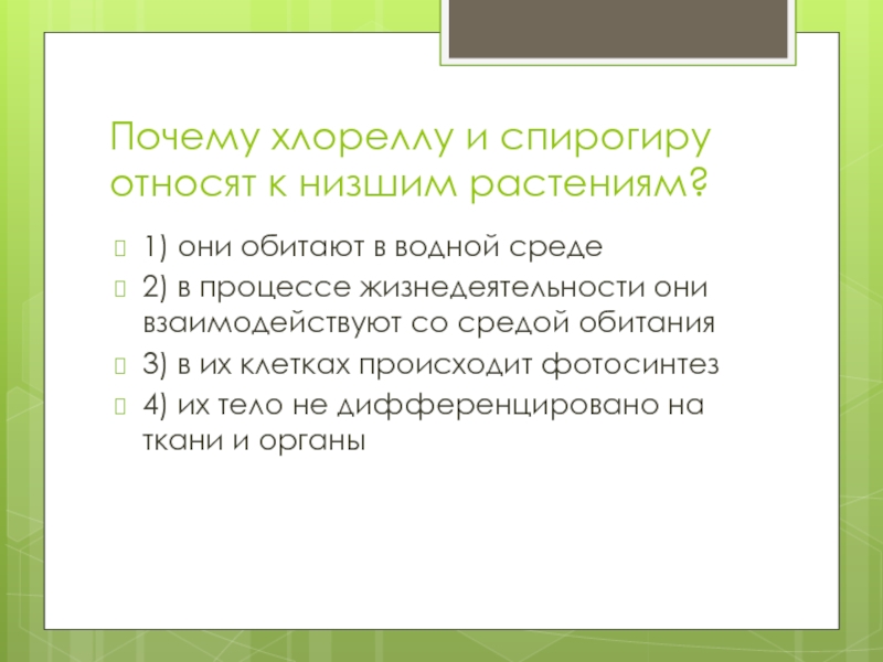 Слайд 9Почему хлореллу и спирогиру относят к низшим растениям?