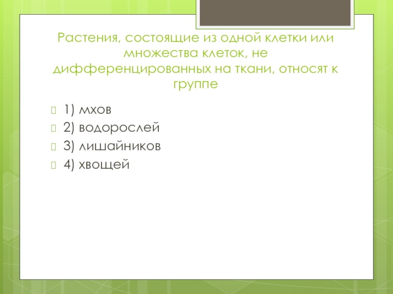 Слайд 8Растения, состоящие из одной клетки или множества клеток, не дифференцированных на