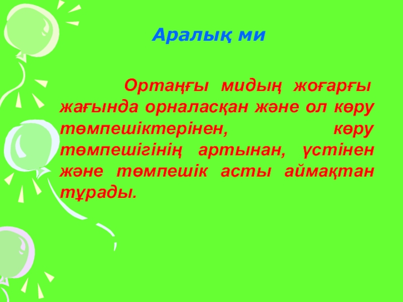Ортаңғы мидың жоғарғы жағында орналасқан және ол көру төмпешіктерінен, көру төмпешігінің артынан, үстінен және төмпешік асты аймақтан тұрады.