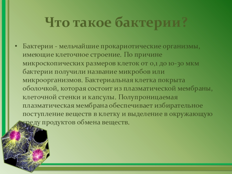 причине микроскопических размеров клеток от 0,1 до 10-30 мкм бактерии получили название микробов или микроорганизмов. Бактериальная клетка покрыта оболочкой, которая состоит из плазматической мембраны, клеточной стенки и капсулы. Полупроницаемая плазматическая мембрана обеспечивает избирательное поступление веществ в клетку и выделение в окружающую среду продуктов обмена веществ.