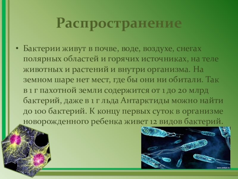 источниках, на теле животных и растений и внутри организма. На земном шаре нет мест, где бы они ни обитали. Так в 1 г пахотной земли содержится от 1 до 20 млрд бактерий, даже в 1 г льда Антарктиды можно найти до 100 бактерий. К концу первых суток в организме новорожденного ребенка живет 12 видов бактерий.