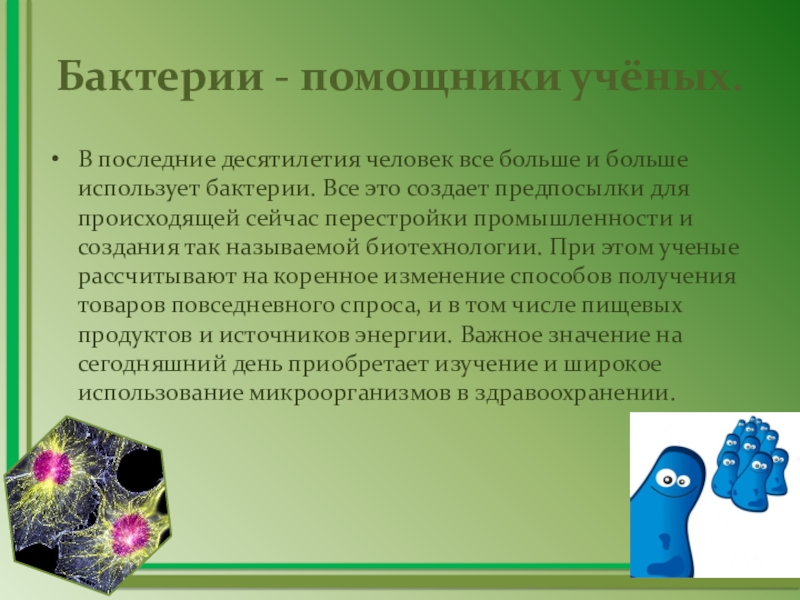 использует бактерии. Все это создает предпосылки для происходящей сейчас перестройки промышленности и создания так называемой биотехнологии. При этом ученые рассчитывают на коренное изменение способов получения товаров повседневного спроса, и в том числе пищевых продуктов и источников энергии. Важное значение на сегодняшний день приобретает изучение и широкое использование микроорганизмов в здравоохранении.