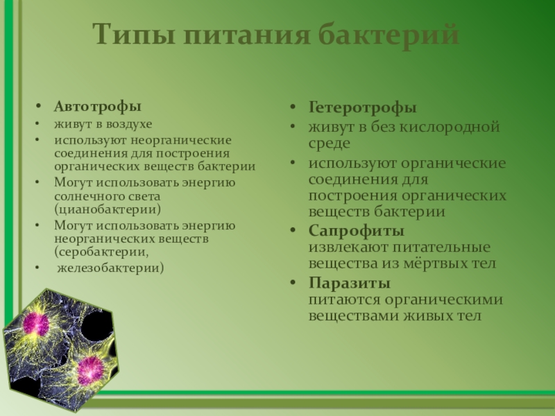бактерии используют свет как источник энергии. Все они окрашены в красный, оранжевый, зеленый или сине-зеленый цвет: ведь для того, чтобы свет произвел работу, он должен быть поглощен каким-либо красителем – пигментом. У бактерий это разнообразные хлорофиллы и каротиноиды. Большинство из них могут связывать молекулярный азот. Обитают они чаще всего в водоемах на поверхности ила, некоторые - в горячих источниках.