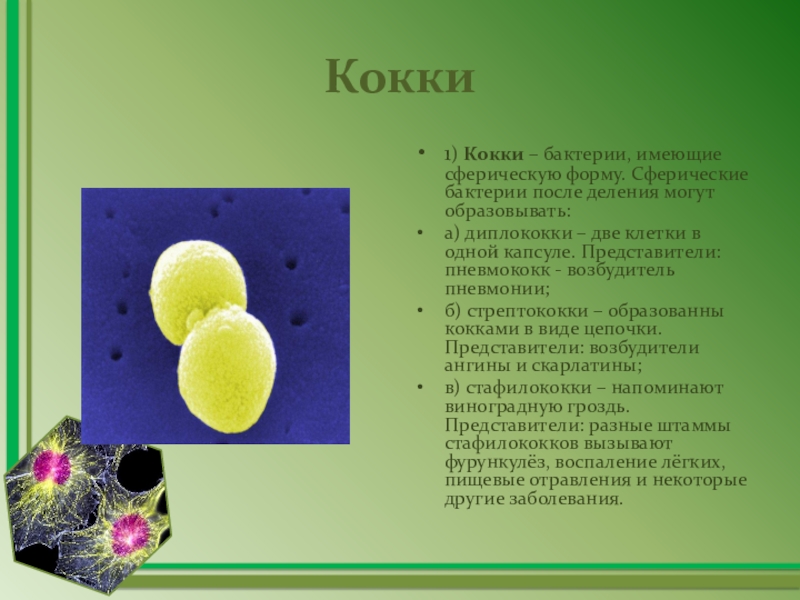 в) стафилококки – напоминают виноградную гроздь. Представители: разные штаммы стафилококков вызывают фурункулёз, воспаление лёгких, пищевые отравления и некоторые другие заболевания.