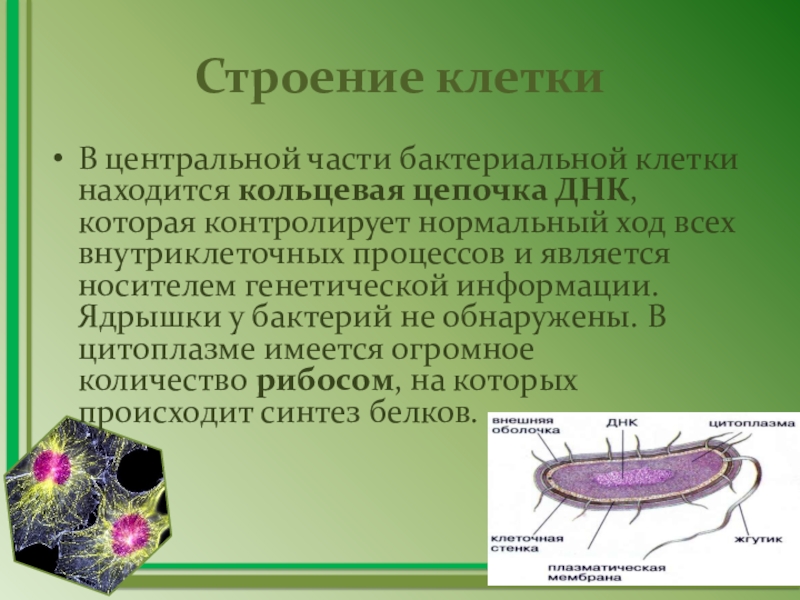 В центральной части бактериальной клетки находится кольцевая цепочка ДНК, которая контролирует