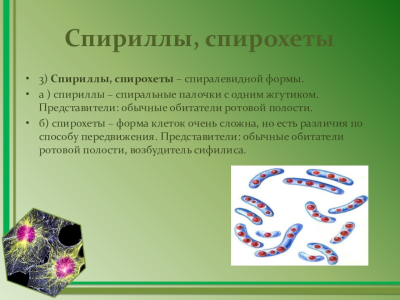 б) спирохеты – форма клеток очень сложна, но есть различия по способу передвижения. Представители: обычные обитатели ротовой полости, возбудитель сифилиса.