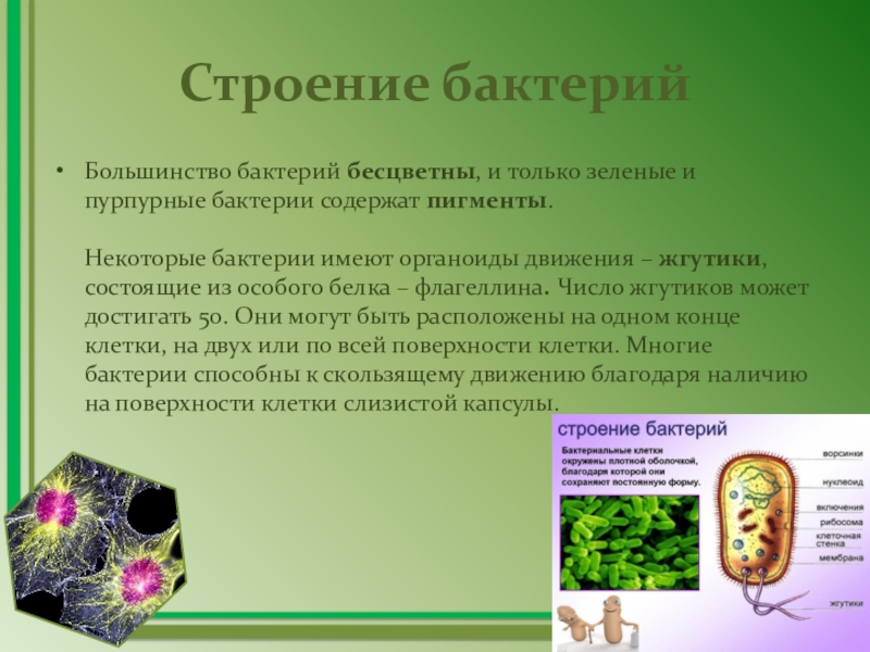 Большинство бактерий бесцветны, и только зеленые и пурпурные бактерии содержат пигменты.