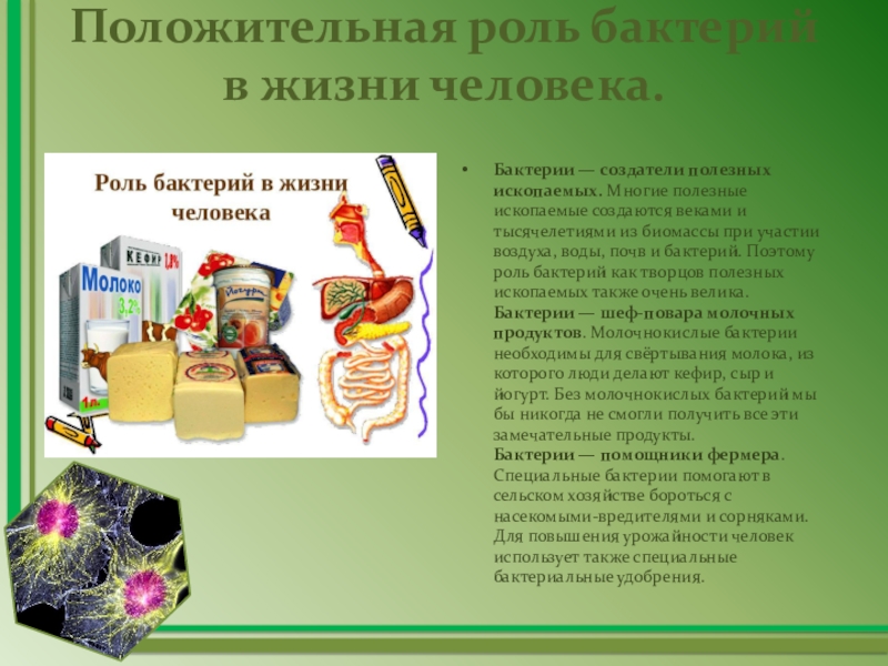 Бактерии — шеф-повара молочных продуктов. Молочнокислые бактерии необходимы для свёртывания молока, из которого люди делают кефир, сыр и йогурт. Без молочнокислых бактерий мы бы никогда не смогли получить все эти замечательные продукты.