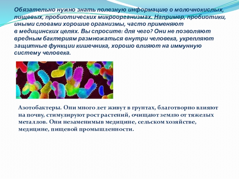 Азотобактеры. Они много лет живут в грунтах, благотворно влияют на почву, стимулируют рост растений, очищают землю от тяжелых металлов. Они незаменимыв медицине, сельском хозяйстве, медицине, пищевой промышленности.
