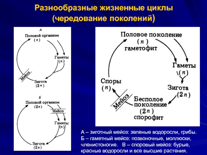 А – зиготный мейоз: зеленые водоросли, грибы. Б