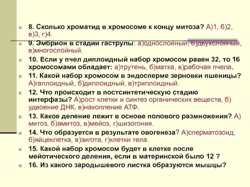 8. Сколько хроматид в хромосоме к концу митоза? А)1, б)2, в)3,