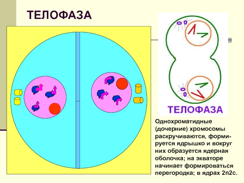 Однохроматидные (дочерние) хромосомы раскручиваются, форми-руется ядрышко и вокруг них образуется ядерная