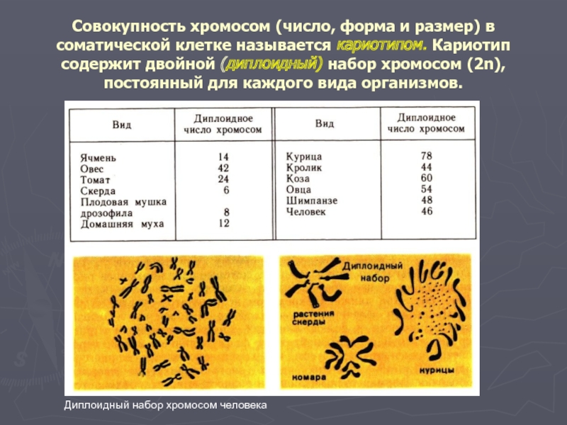 Слайд 12Совокупность хромосом (число, форма и размер) в соматической клетке называется кариотипом.