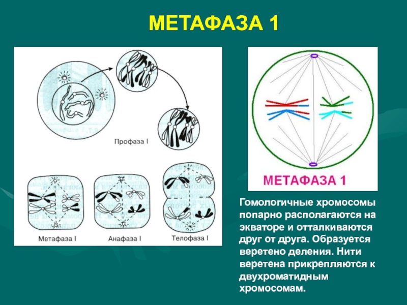 К полюсам расходятся гомологичные хромосомы, состоящие из двух хроматид. Происходит