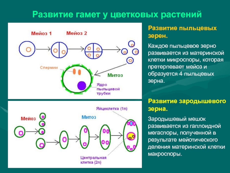 поколение. Зрелые гаметы получают гаплоидное число (n) хромосом, а при оплодотворении восстанавливается характерное для данного вида диплоидное число хромосом.