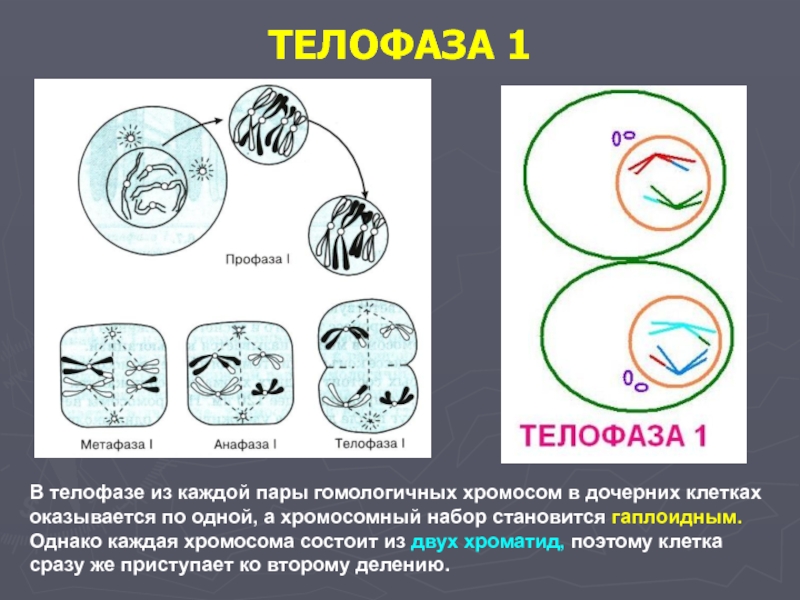 В телофазе из каждой пары гомологичных хромосом в дочерних клетках