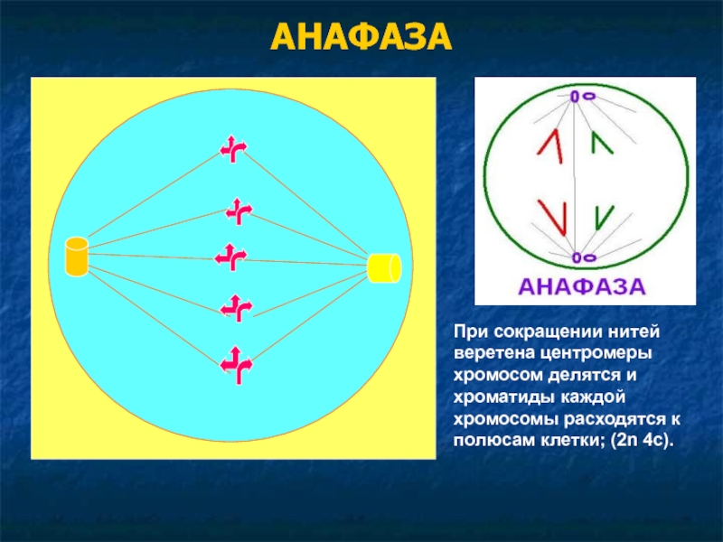 При сокращении нитей веретена центромеры хромосом делятся и хроматиды каждой хромосомы