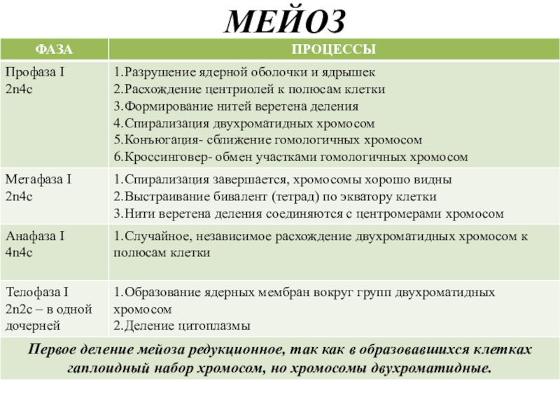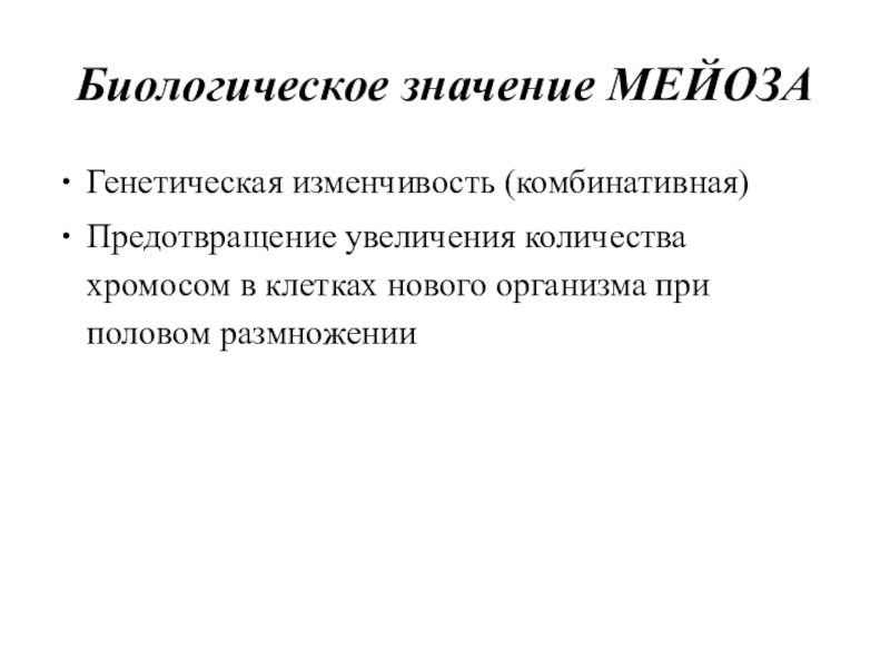 Биологическое значение МЕЙОЗАГенетическая изменчивость (комбинативная)Предотвращение увеличения количества хромосом в клетках нового организма при половом размножении