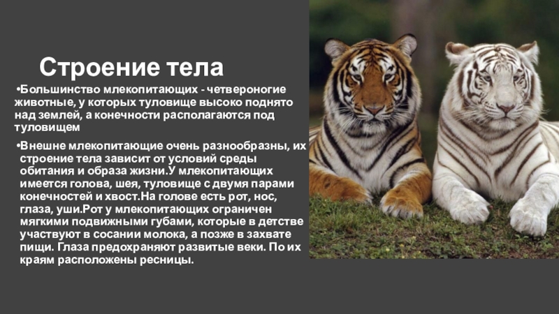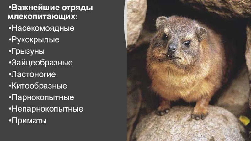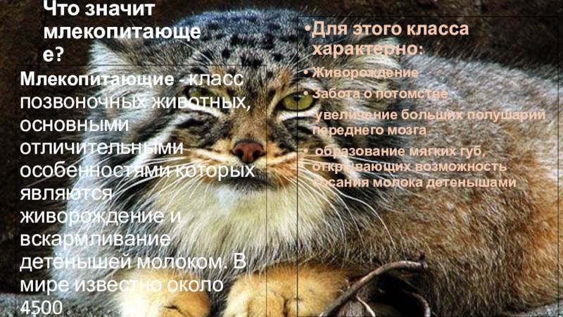Млекопитающие - класс позвоночных животных, основными отличительными особенностями которых являются живорождение и вскармливание детёнышей молоком. В мире известно около 4500 видов млекопитающих.