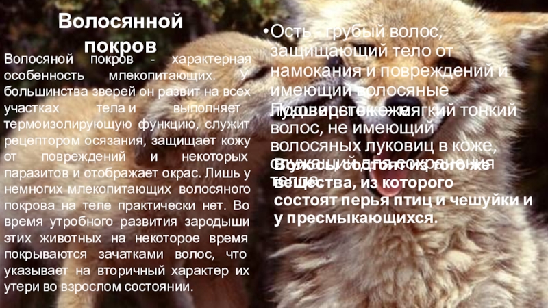 Волосяной покров - характерная особенность млекопитающих. У большинства зверей он развит на всех участках тела и выполняет термоизолирующую функцию, служит рецептором осязания, защищает кожу от повреждений и некоторых паразитов и отображает окрас. Лишь у немногих млекопитающих волосяного покрова на теле практически нет. Во время утробного развития зародыши этих животных на некоторое время покрываются зачатками волос, что указывает на вторичный характер их утери во взрослом состоянии.