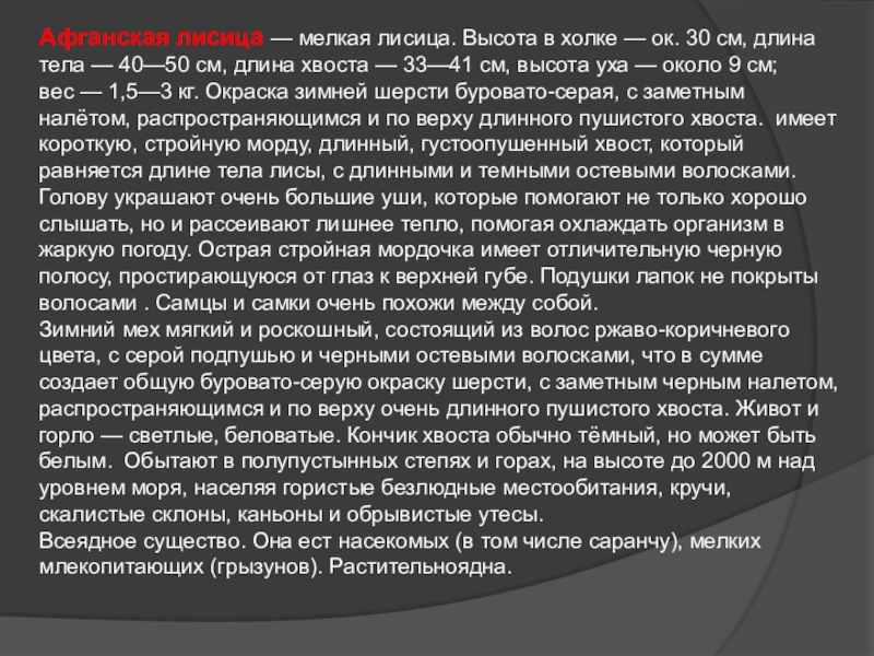 Слайд 17Афганская лисица — мелкая лисица. Высота в холке — ок. 30 см, длина тела —