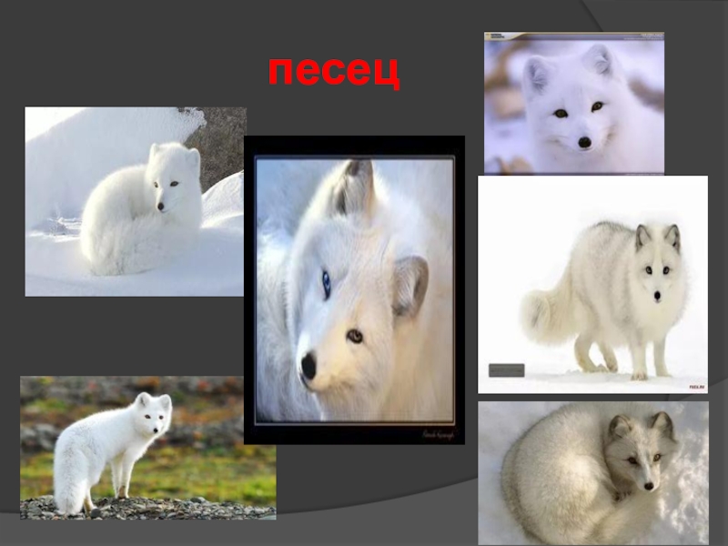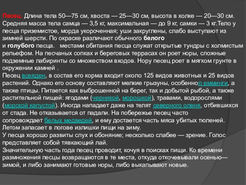 Слайд 11Песец. Длина тела 50—75 см, хвоста — 25—30 см, высота в холке — 20—30 см. Средняя