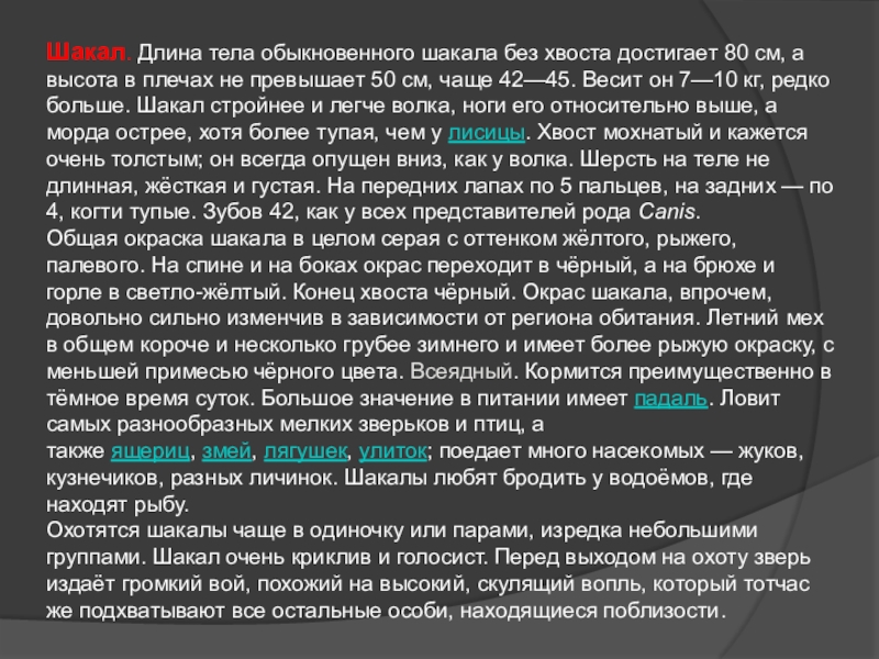 Слайд 9Шакал. Длина тела обыкновенного шакала без хвоста достигает 80 см, а высота