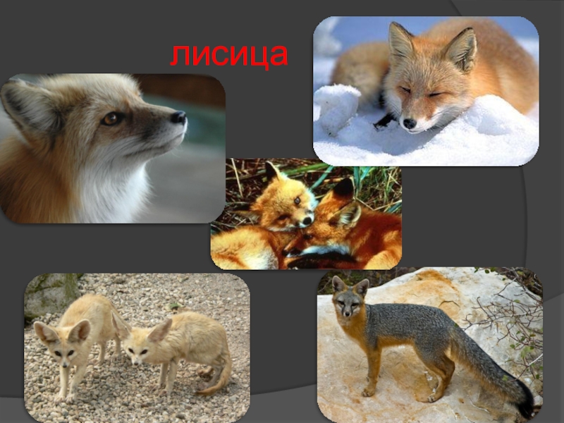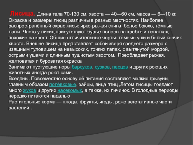 Слайд 19 Лисица. Длина тела 70-130 см, хвоста — 40—60 см, масса — 6—10 кг. Окраска и размеры
