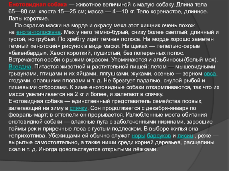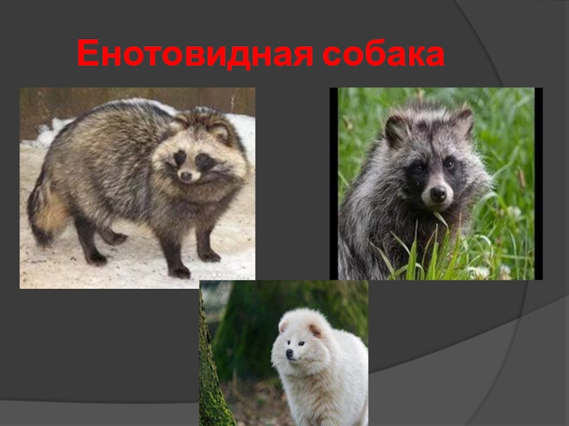 Слайд 4Енотовидная собака — животное величиной с малую собаку. Длина тела 65—80 см, хвоста