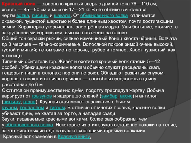 Слайд 15Красный волк — довольно крупный зверь с длиной тела 76—110 см, хвоста — 45—50 см