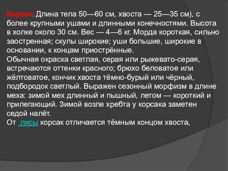 Слайд 13Корсак. Длина тела 50—60 см, хвоста — 25—35 см), с более крупными ушами