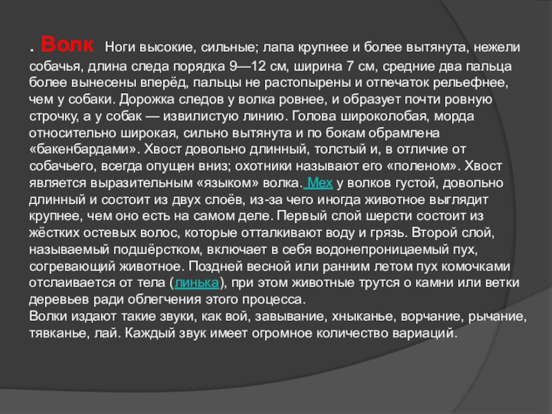 Слайд 6. Волк Ноги высокие, сильные; лапа крупнее и более вытянута, нежели