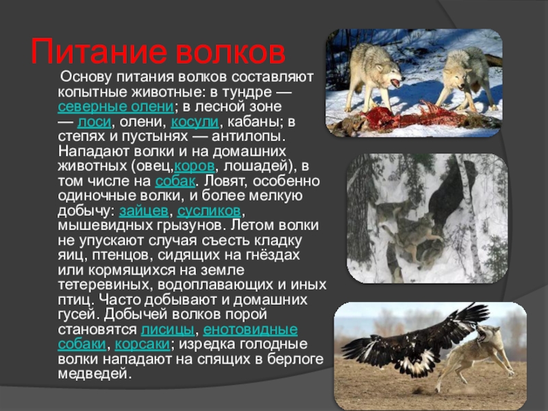 тундре —северные олени; в лесной зоне — лоси, олени, косули, кабаны; в степях и пустынях — антилопы. Нападают волки и на домашних животных (овец,коров, лошадей), в том числе на собак. Ловят, особенно одиночные волки, и более мелкую добычу: зайцев, сусликов, мышевидных грызунов. Летом волки не упускают случая съесть кладку яиц, птенцов, сидящих на гнёздах или кормящихся на земле тетеревиных, водоплавающих и иных птиц. Часто добывают и домашних гусей. Добычей волков порой становятся лисицы, енотовидные собаки, корсаки; изредка голодные волки нападают на спящих в берлоге медведей.
