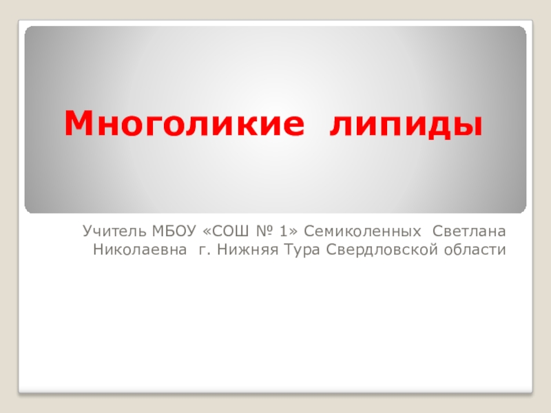 Многоликие липиды  Учитель МБОУ «СОШ № 1» Семиколенных Светлана  Николаевна г. Нижняя Тура Свердловской области