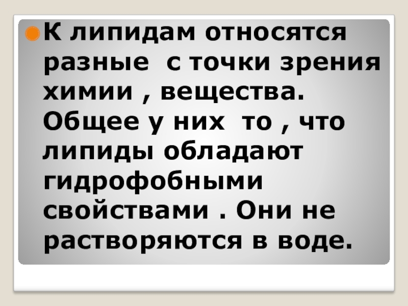 К липидам относятся разные с точки зрения химии , вещества. Общее у них то , что липиды