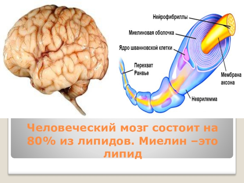 Слайд 9Человеческий мозг состоит на 80% из липидов. Миелин –это липид