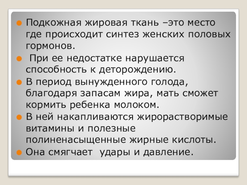 Подкожная жировая ткань –это место где происходит синтез женских половых гормонов. При ее недостатке нарушается способность к
