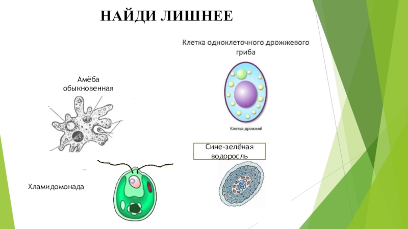 НАЙДИ ЛИШНЕЕАмёба обыкновеннаяХламидомонадаСине-зелёная водоросль