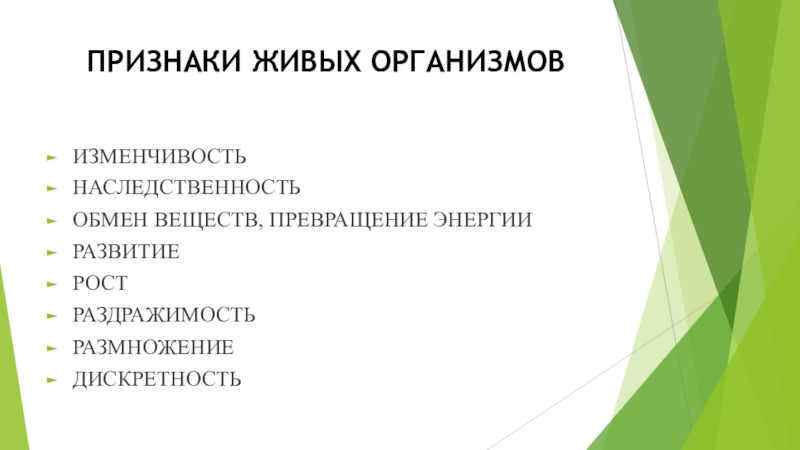 ПРИЗНАКИ ЖИВЫХ ОРГАНИЗМОВИЗМЕНЧИВОСТЬНАСЛЕДСТВЕННОСТЬОБМЕН ВЕЩЕСТВ, ПРЕВРАЩЕНИЕ ЭНЕРГИИРАЗВИТИЕРОСТРАЗДРАЖИМОСТЬРАЗМНОЖЕНИЕДИСКРЕТНОСТЬ