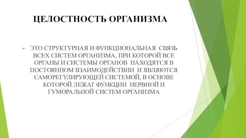 ЦЕЛОСТНОСТЬ ОРГАНИЗМАЭТО СТРУКТУРНАЯ И ФУНКЦИОНАЛЬНАЯ СВЯЗЬ ВСЕХ СИСТЕМ ОРГАНИЗМА, ПРИ КОТОРОЙ ВСЕ ОРГАНЫ И СИСТЕМЫ ОРГАНОВ НАХОДЯТСЯ