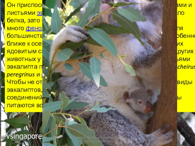 Чтобы не отравиться, коалы выбирают в пищу только те виды эвкалиптов, которые содержат меньше фенольных соединений. Как следствие, из 800 видов эвкалипта коалы питаются всего 120 видами.
