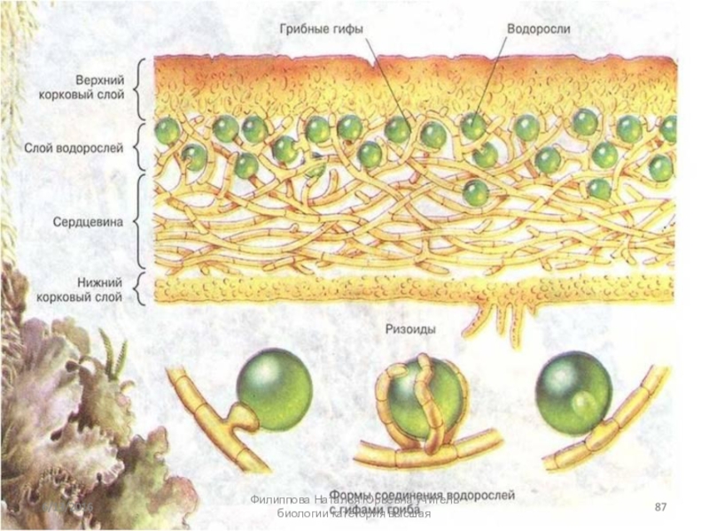 Слоевище имеет вид пластинки, прикрепленной к субстрату выростами гиф - ризинами