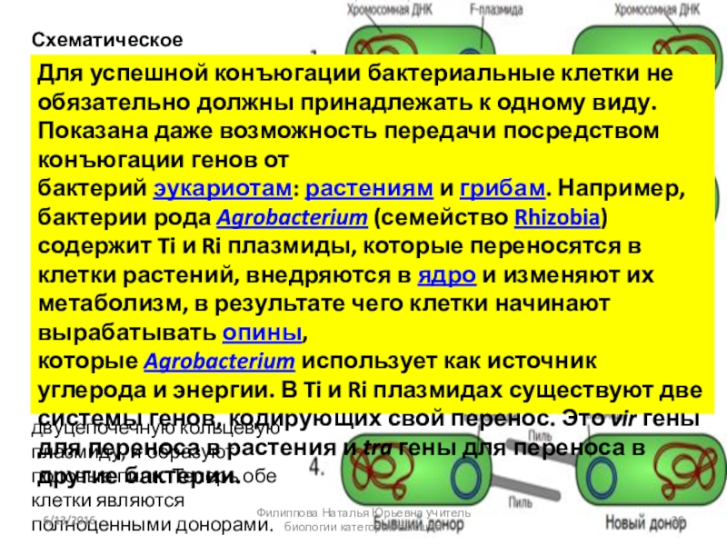 Для успешной конъюгации бактериальные клетки не обязательно должны принадлежать к одному виду. Показана даже возможность передачи посредством конъюгации генов от бактерий эукариотам: растениям и грибам. Например, бактерии рода Agrobacterium (семейство Rhizobia) содержит Ti и Ri плазмиды, которые переносятся в клетки растений, внедряются в ядро и изменяют их метаболизм, в результате чего клетки начинают вырабатывать опины, которые Agrobacterium использует как источник углерода и энергии. В Ti и Ri плазмидах существуют две системы генов, кодирующих свой перенос. Это vir гены для переноса в растения и tra гены для переноса в другие бактерии.