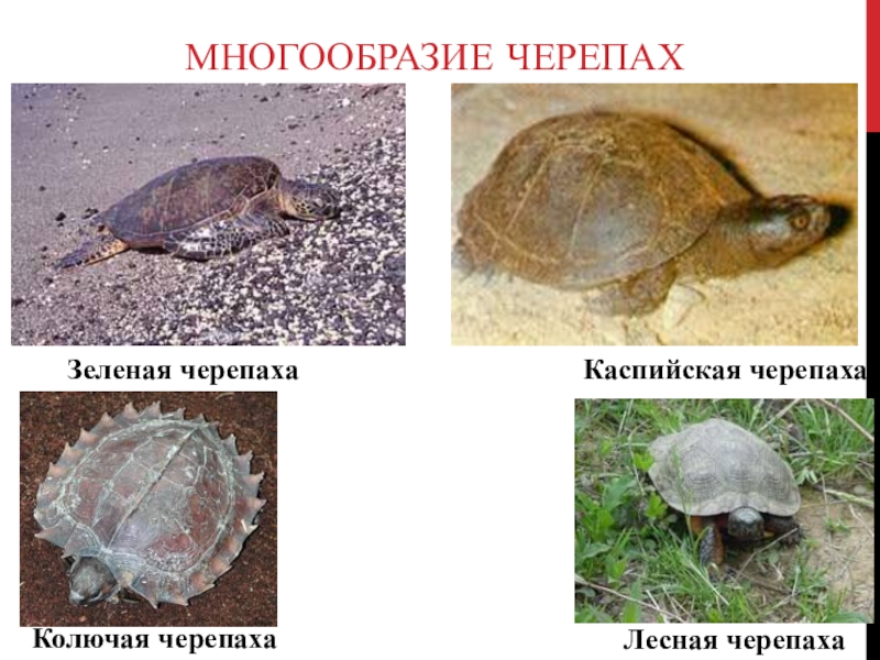 МНОГООБРАЗИЕ ЧЕРЕПАХЗеленая черепахаКаспийская черепахаКолючая черепахаЛесная черепаха