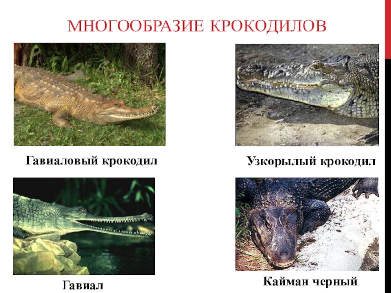 МНОГООБРАЗИЕ КРОКОДИЛОВКайман черныйУзкорылый крокодилГавиалГавиаловый крокодил