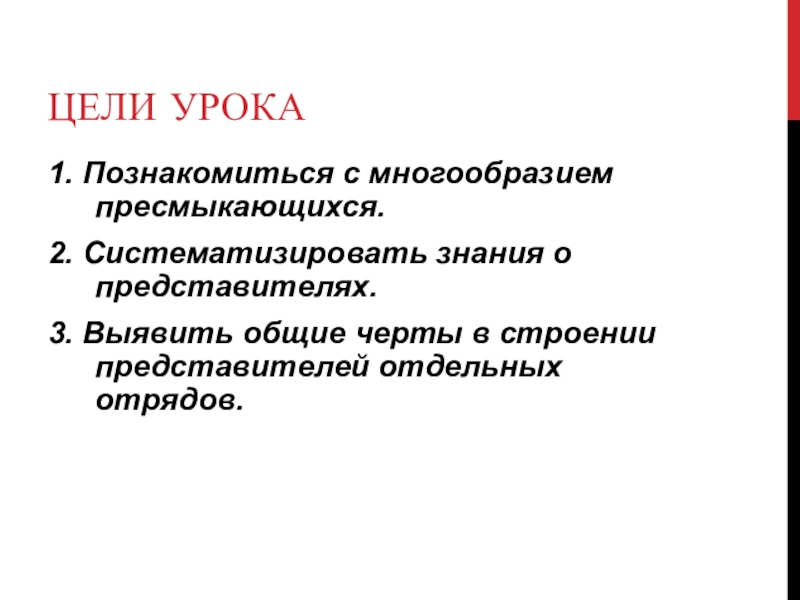 ЦЕЛИ УРОКА1. Познакомиться с многообразием пресмыкающихся.2. Систематизировать знания о представителях.3. Выявить общие черты в строении представителей отдельных отрядов.