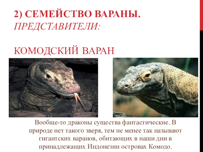 2) СЕМЕЙСТВО ВАРАНЫ.  ПРЕДСТАВИТЕЛИ:   КОМОДСКИЙ ВАРАНВообще-то драконы существа фантастические. В природе нет такого зверя, тем