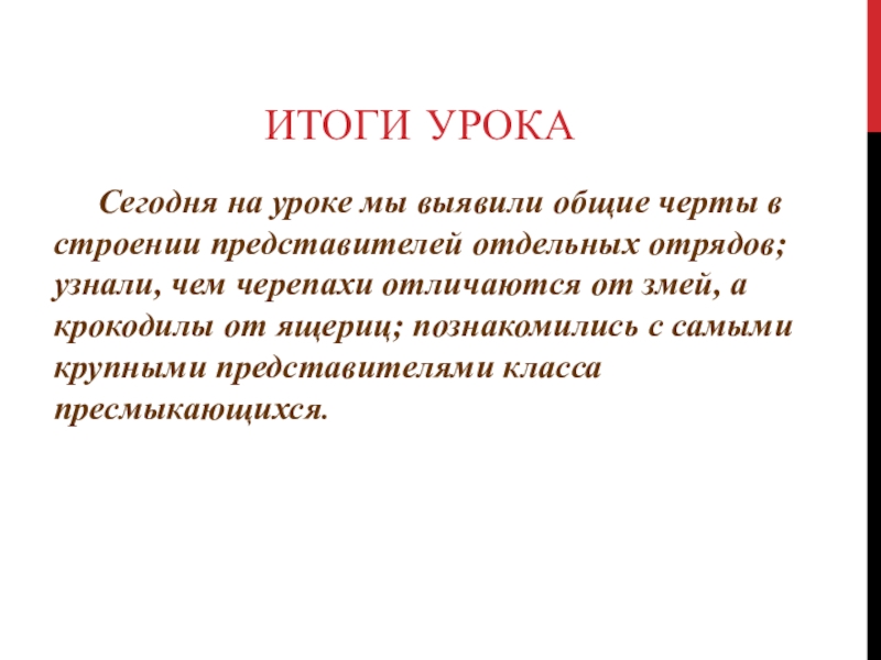ИТОГИ УРОКА	Сегодня на уроке мы выявили общие черты в строении представителей отдельных отрядов; узнали, чем черепахи отличаются