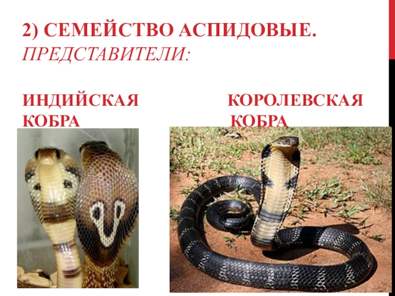 2) СЕМЕЙСТВО АСПИДОВЫЕ.  ПРЕДСТАВИТЕЛИ:   ИНДИЙСКАЯ          КОРОЛЕВСКАЯ