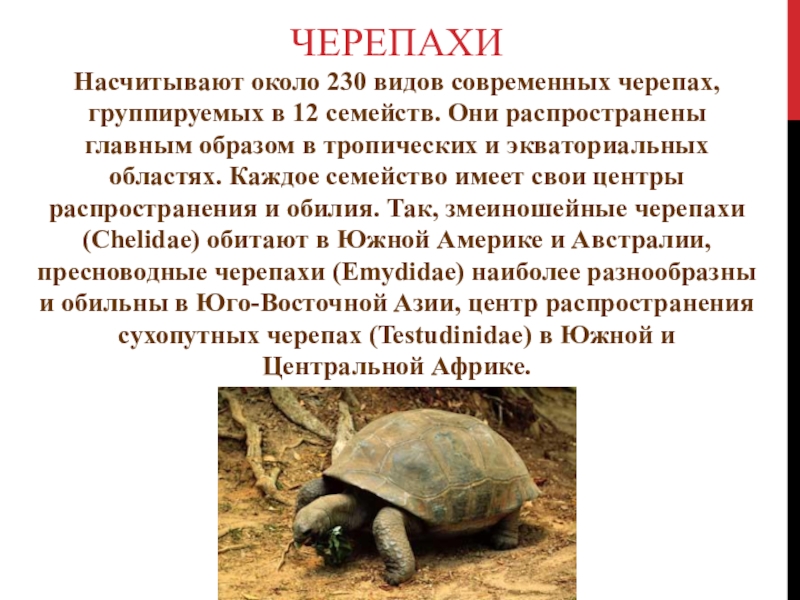 ЧЕРЕПАХИНасчитывают около 230 видов современных черепах, группируемых в 12 семейств. Они распространены главным образом в тропических и